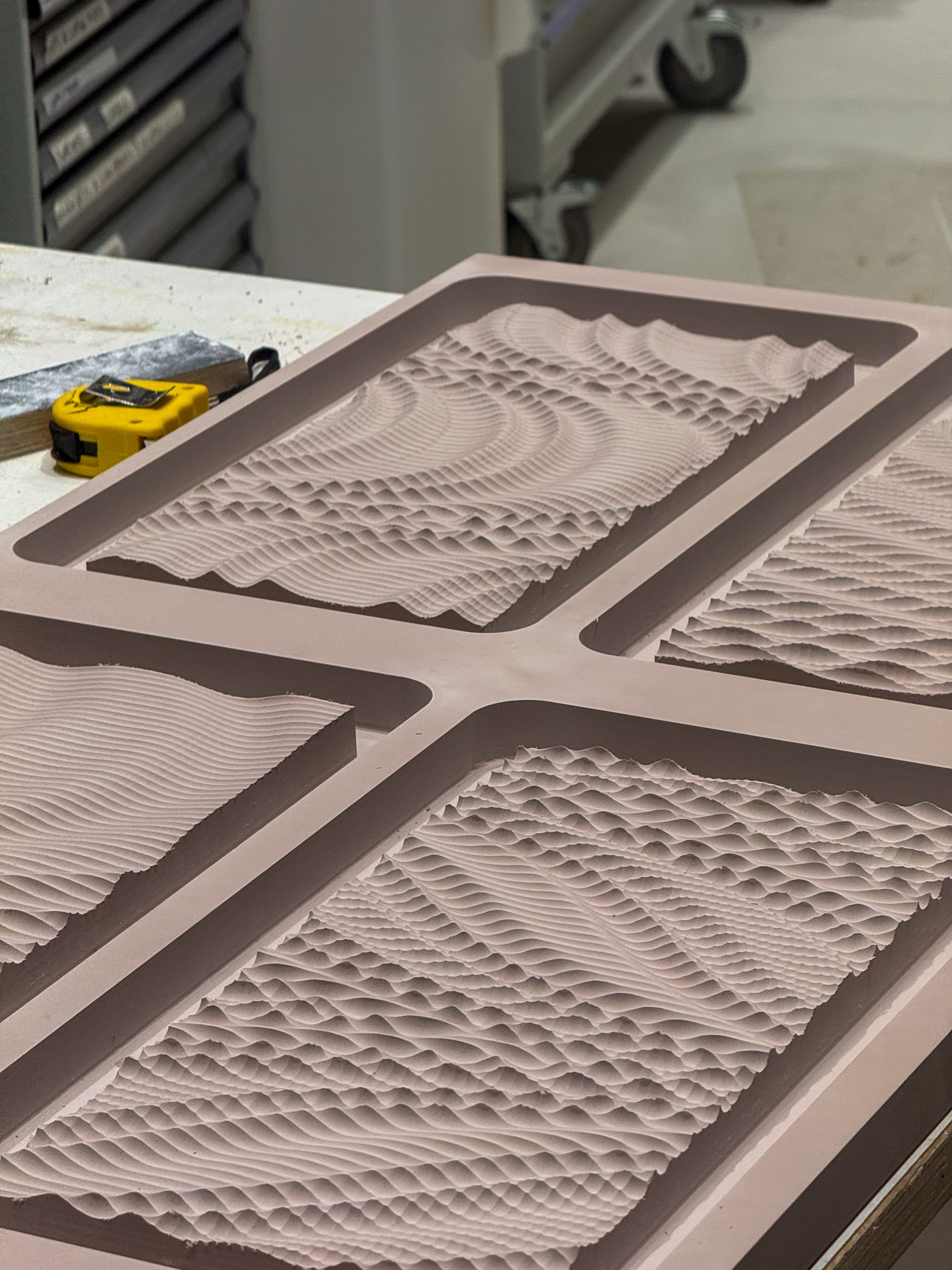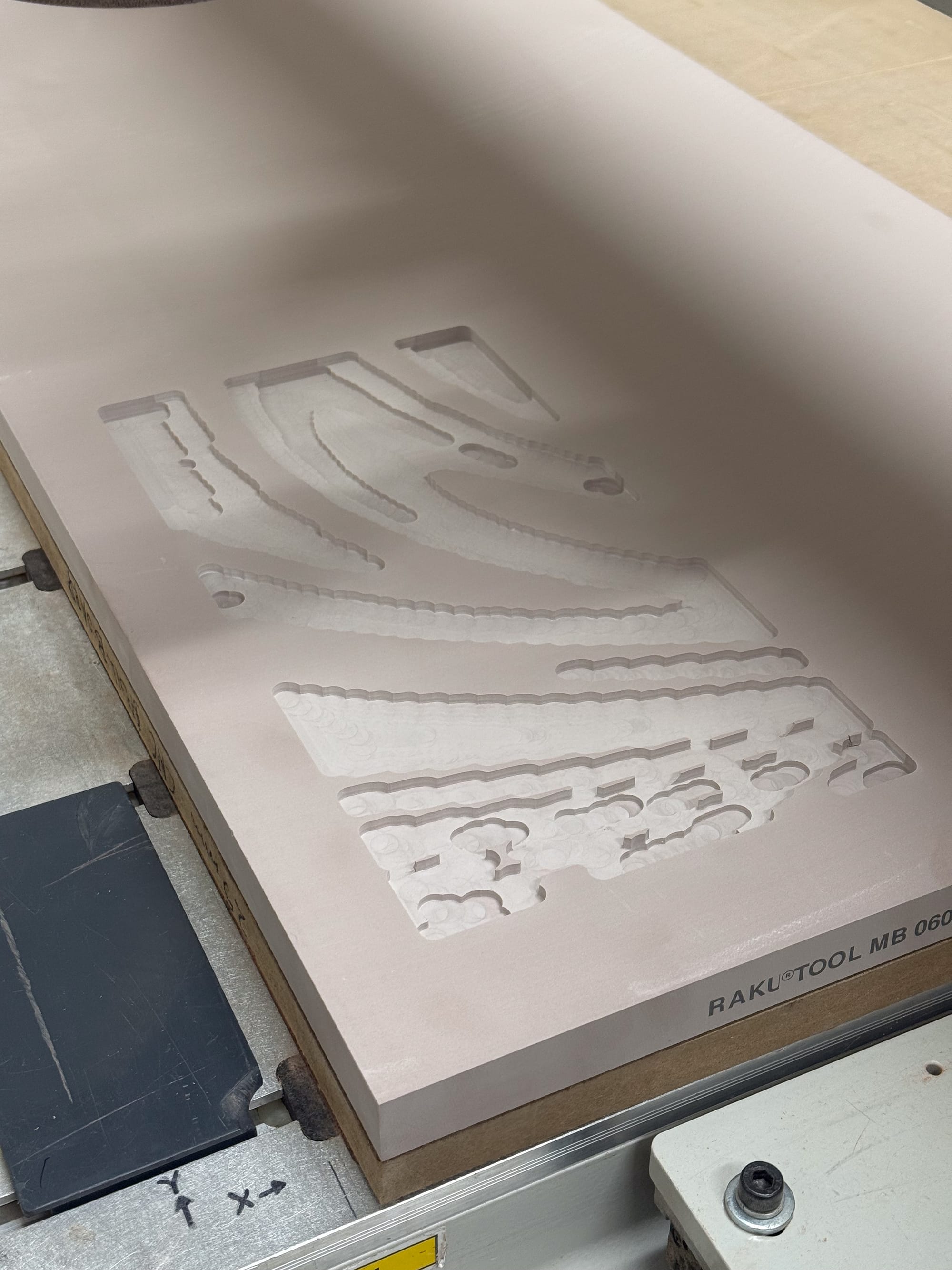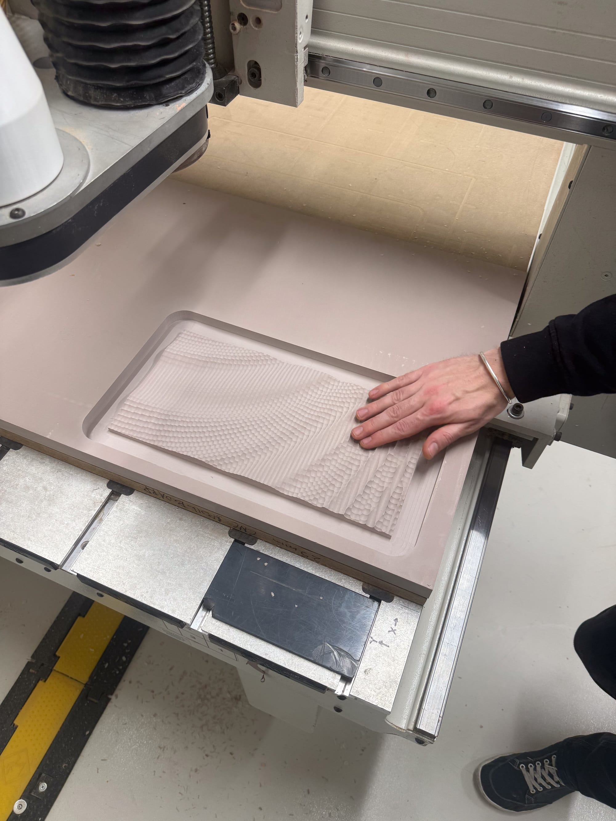 Chemiwood proved to be a stable and forgiving material for this process, particularly in its compatibility with downstream moulding workflows and polarity inversion through silicone casting. Grasshopper-generated meshes were also used to define roughing templates, ensuring excess material was removed efficiently and reducing unnecessary strain during machining.