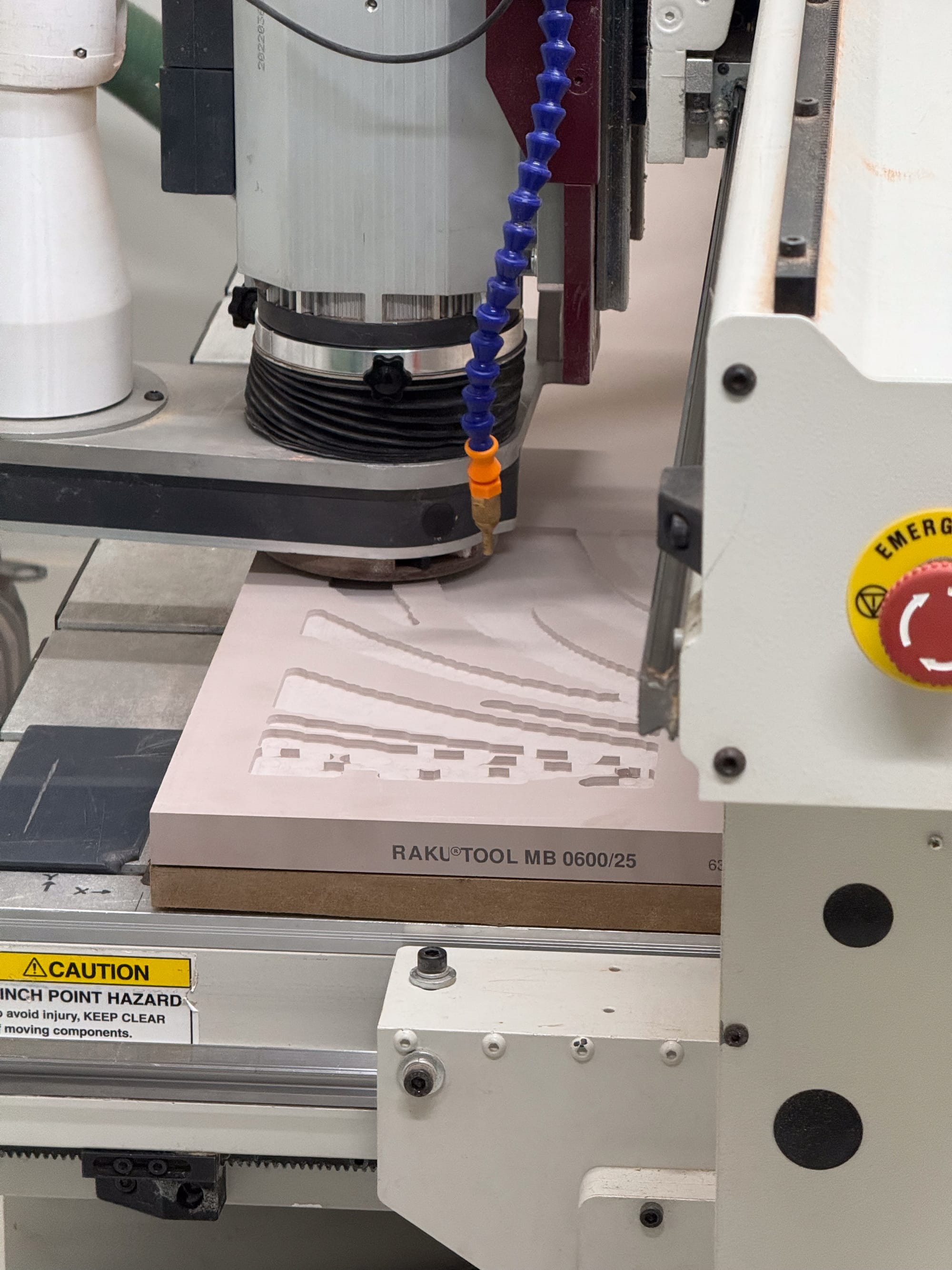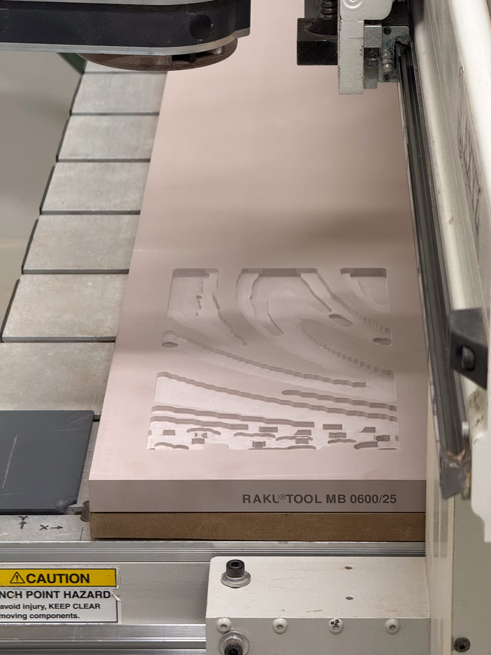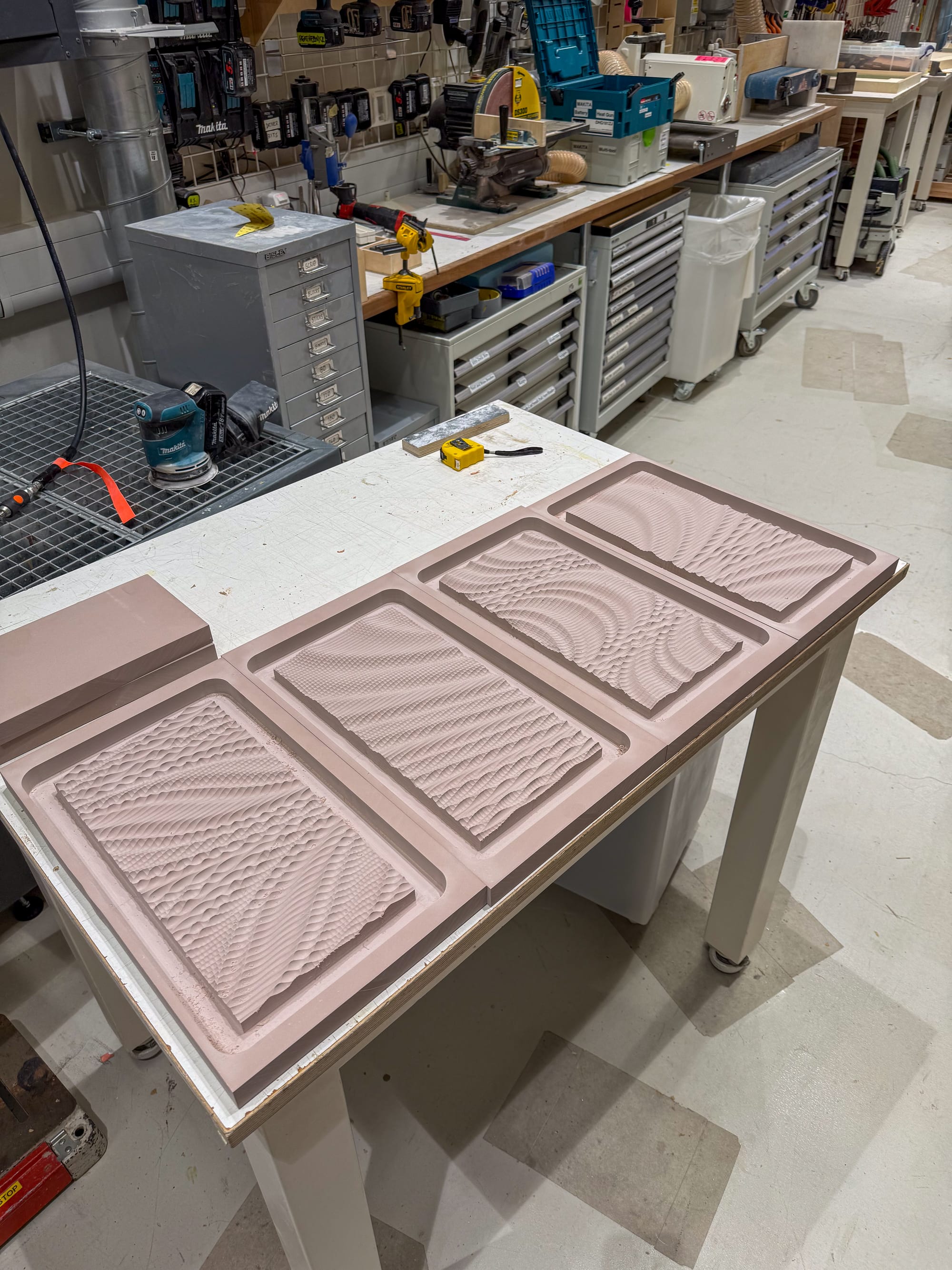 Chemiwood proved to be a stable and forgiving material for this process, particularly in its compatibility with downstream moulding workflows and polarity inversion through silicone casting. Grasshopper-generated meshes were also used to define roughing templates, ensuring excess material was removed efficiently and reducing unnecessary strain during machining.