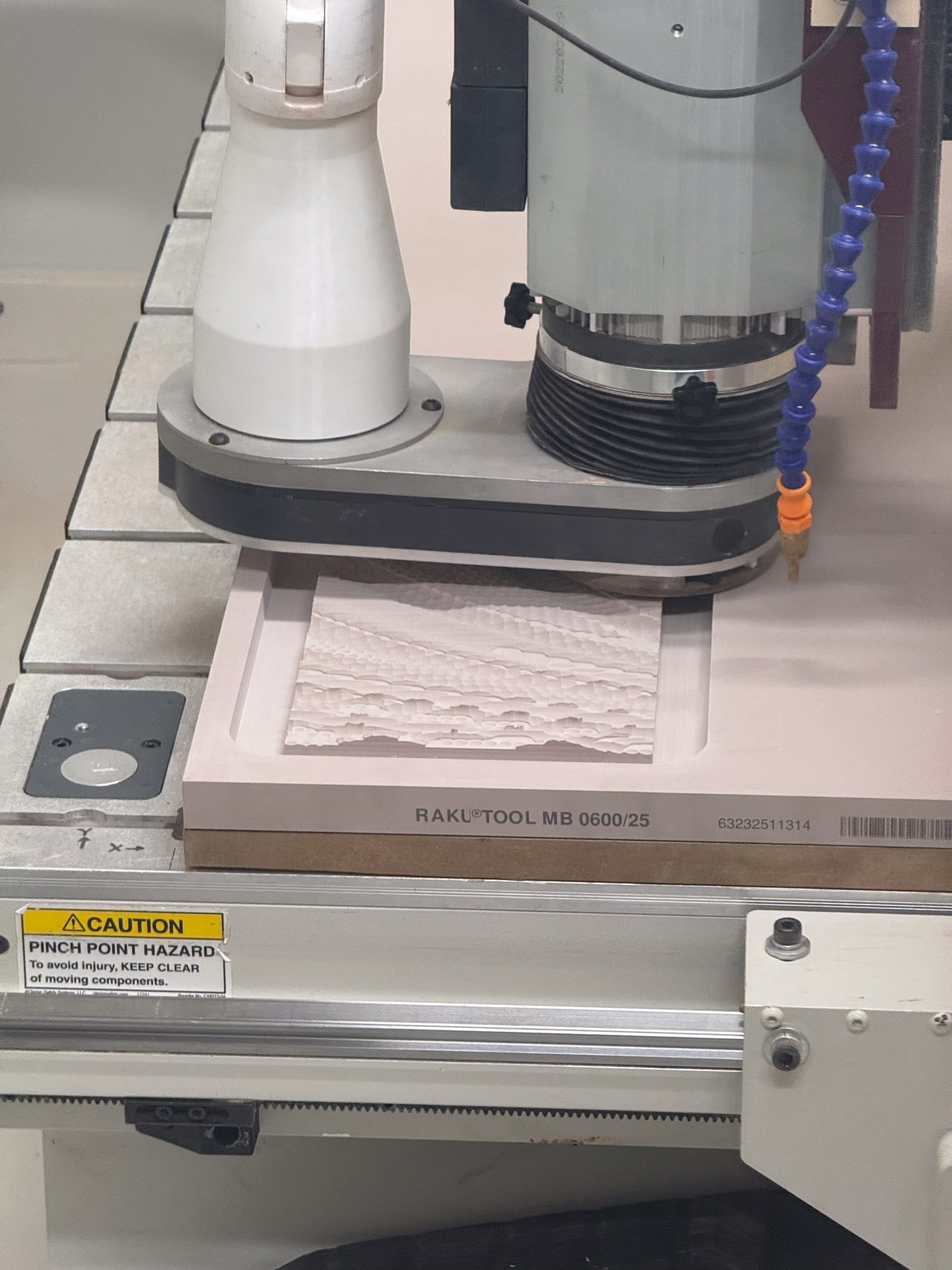 Each tile was produced through a two-stage workflow: an initial roughing pass using a flat-end mill to remove bulk material and minimise stress on the tool, followed by a finishing pass using a ball-nose bit that traced the pattern as a series of engraving curves. All toolpaths were generated in RhinoCAM, with average milling times of 30–35 minutes per tile, excluding tool changes.