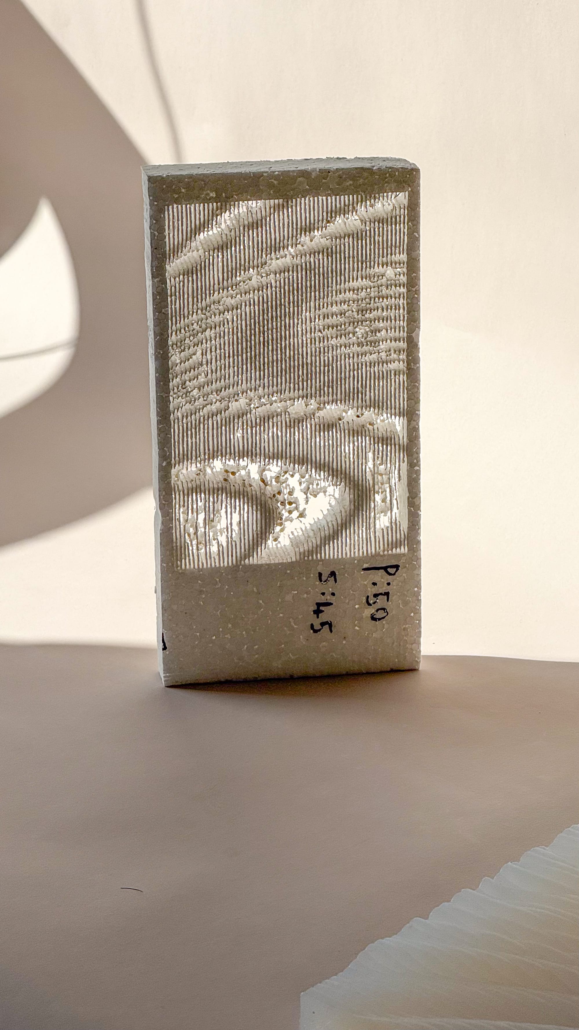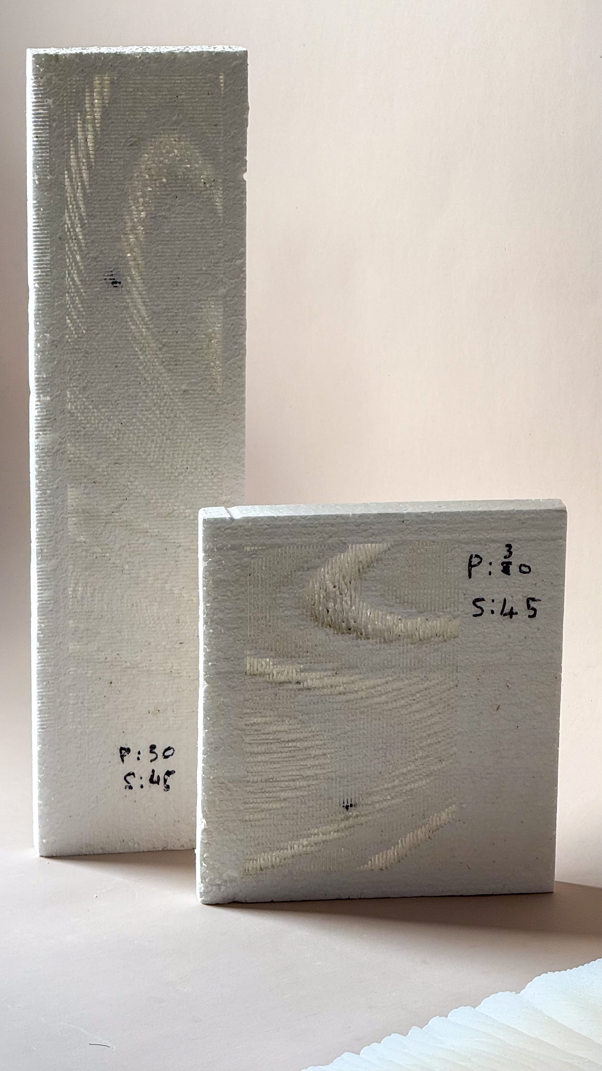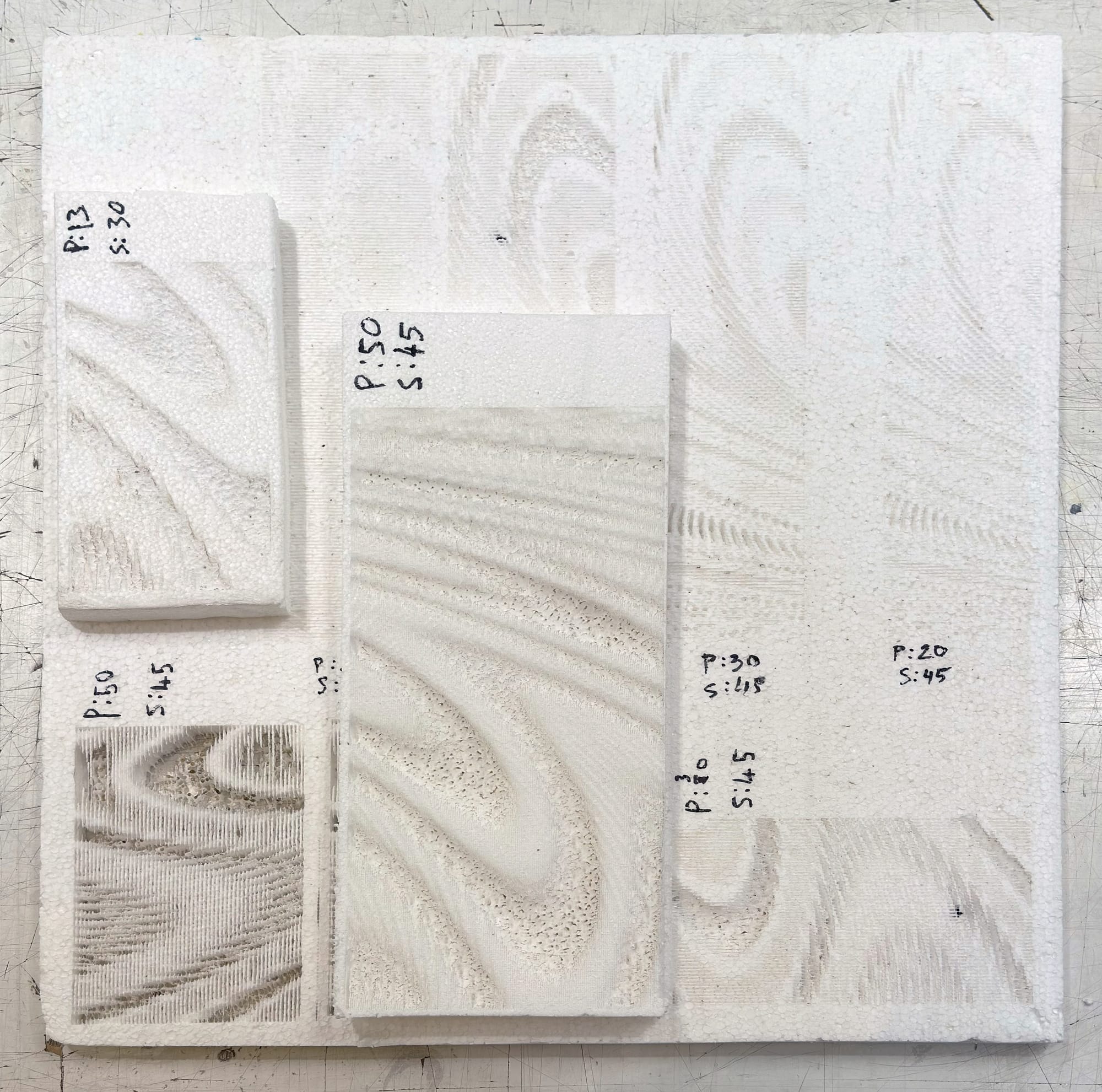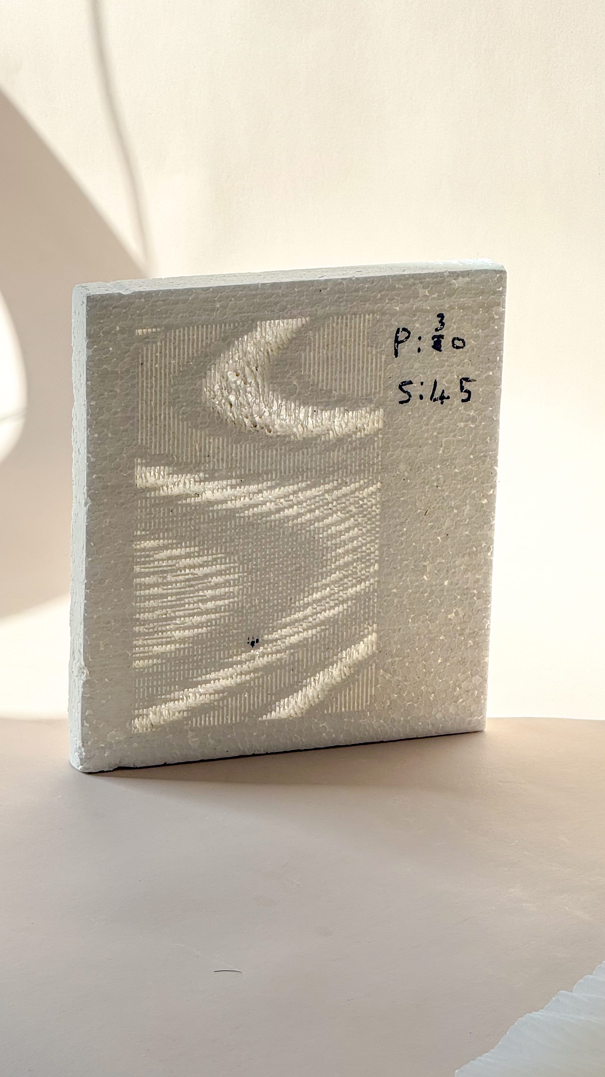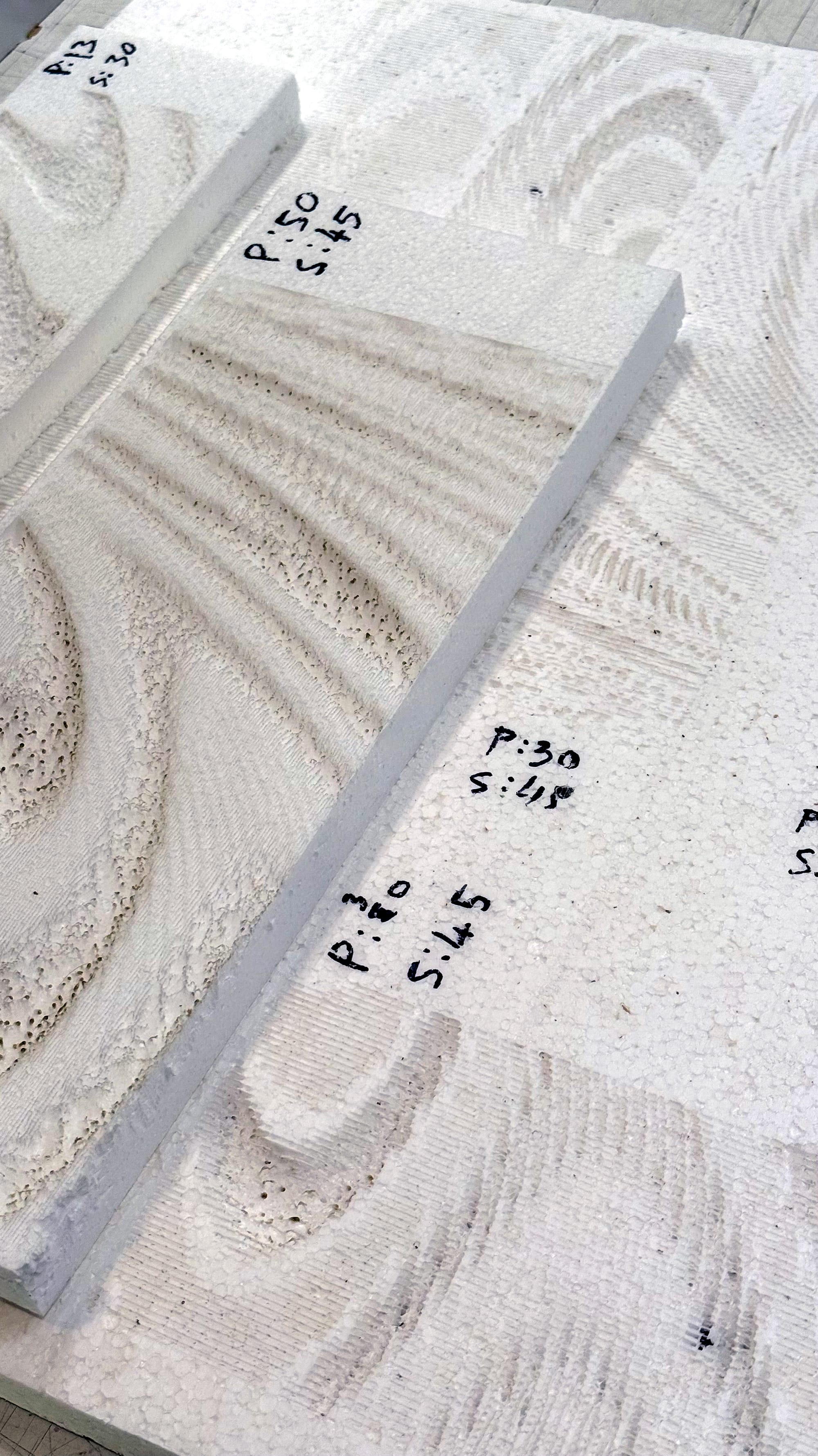 Laser etching provided the most straightforward translation. The diagrams were converted into greyscale bitmaps, where tonal variation controlled laser intensity. Initial tests were conducted on Styrofoam, which proved responsive due to its softness and porosity. One of the more interesting outcomes was the ability to modulate transparency through pattern density.