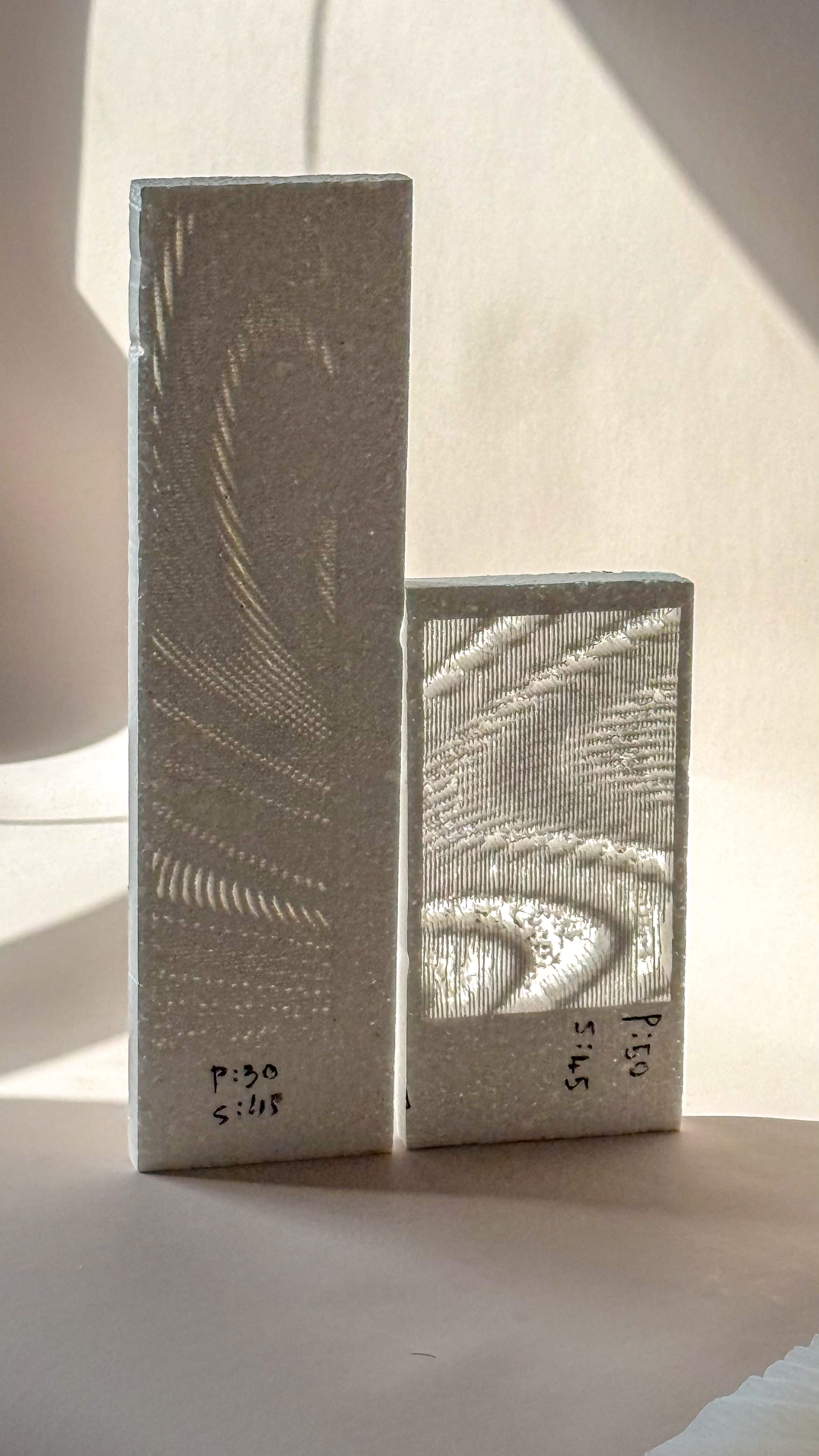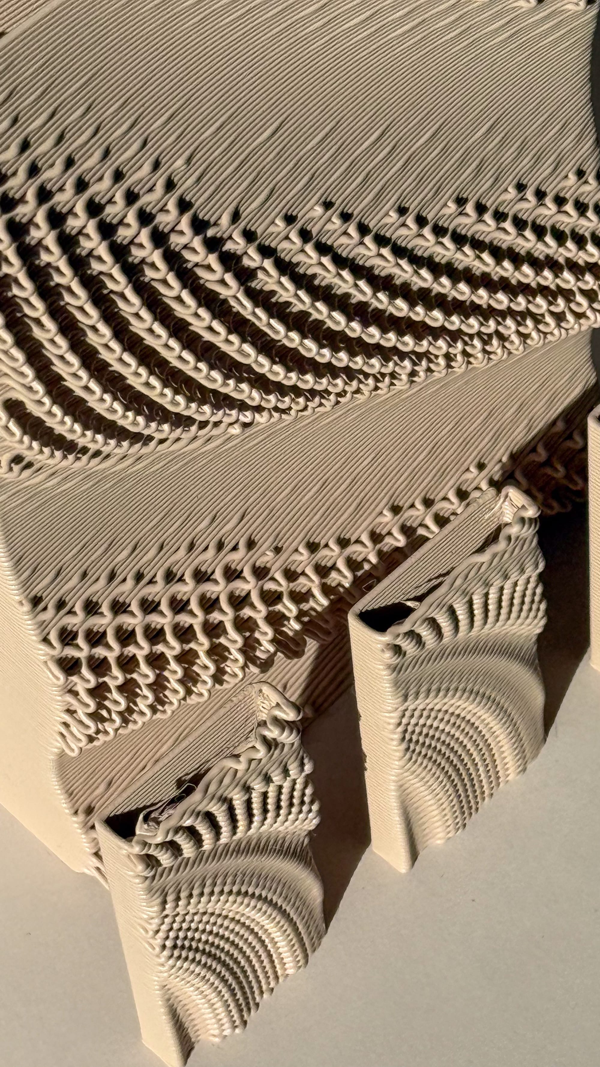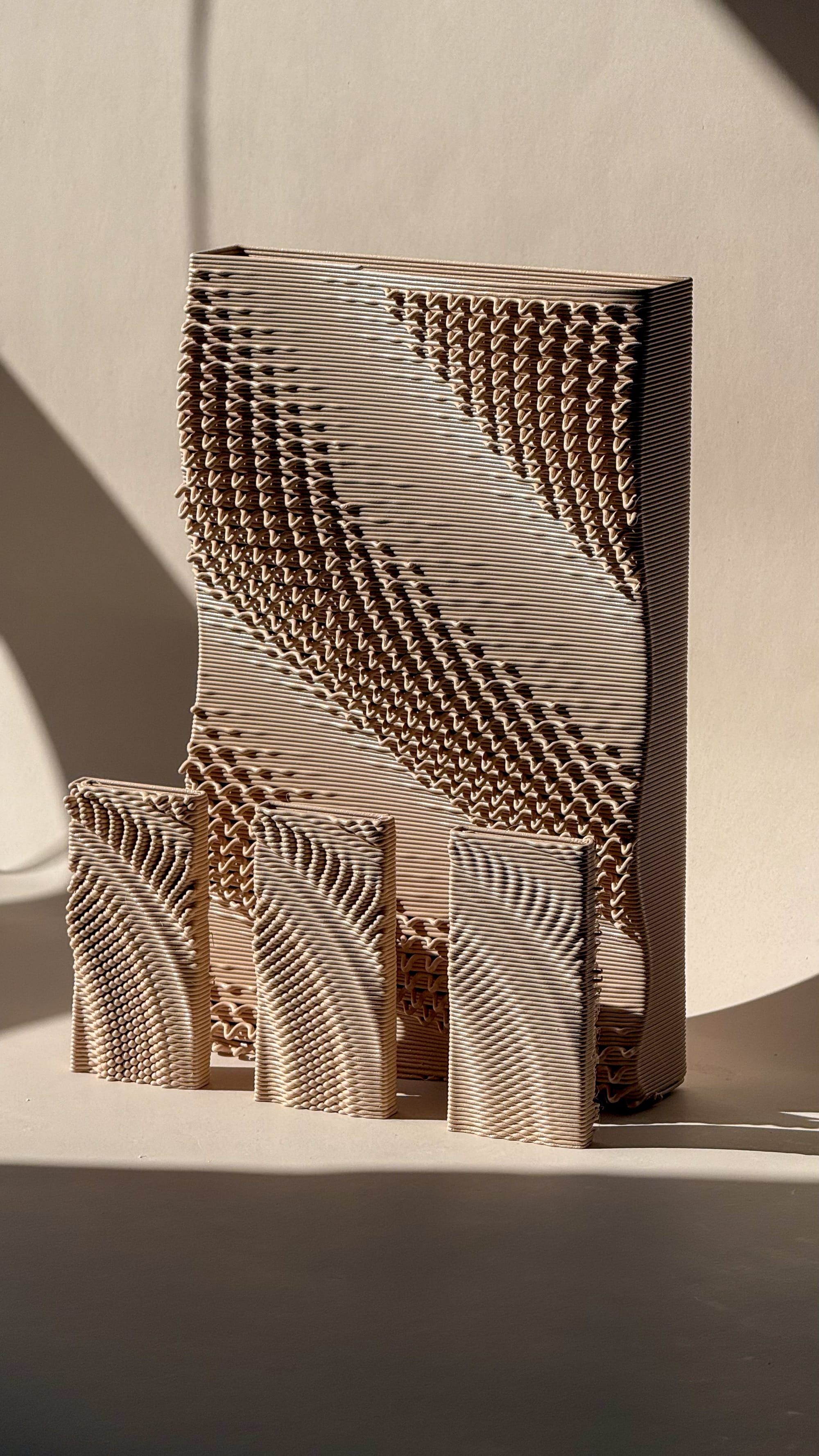 Early issues included inconsistent bed adhesion, often due to insufficient temperature, and minor modelling errors that affected print stability. In one instance, printing PLA at PETG temperatures led to excessive melting, altering the microtexture and causing structural instability. As the G-code workflow became more refined, I began to explore alternative pattern translations. One approach involved encoding the pattern within a single layer, shifting from vertical undulation in Z to planar variation. Despite this geometric shift, the results remained recognisably part of the same system, demonstrating how the pattern could persist across different modes of expression.