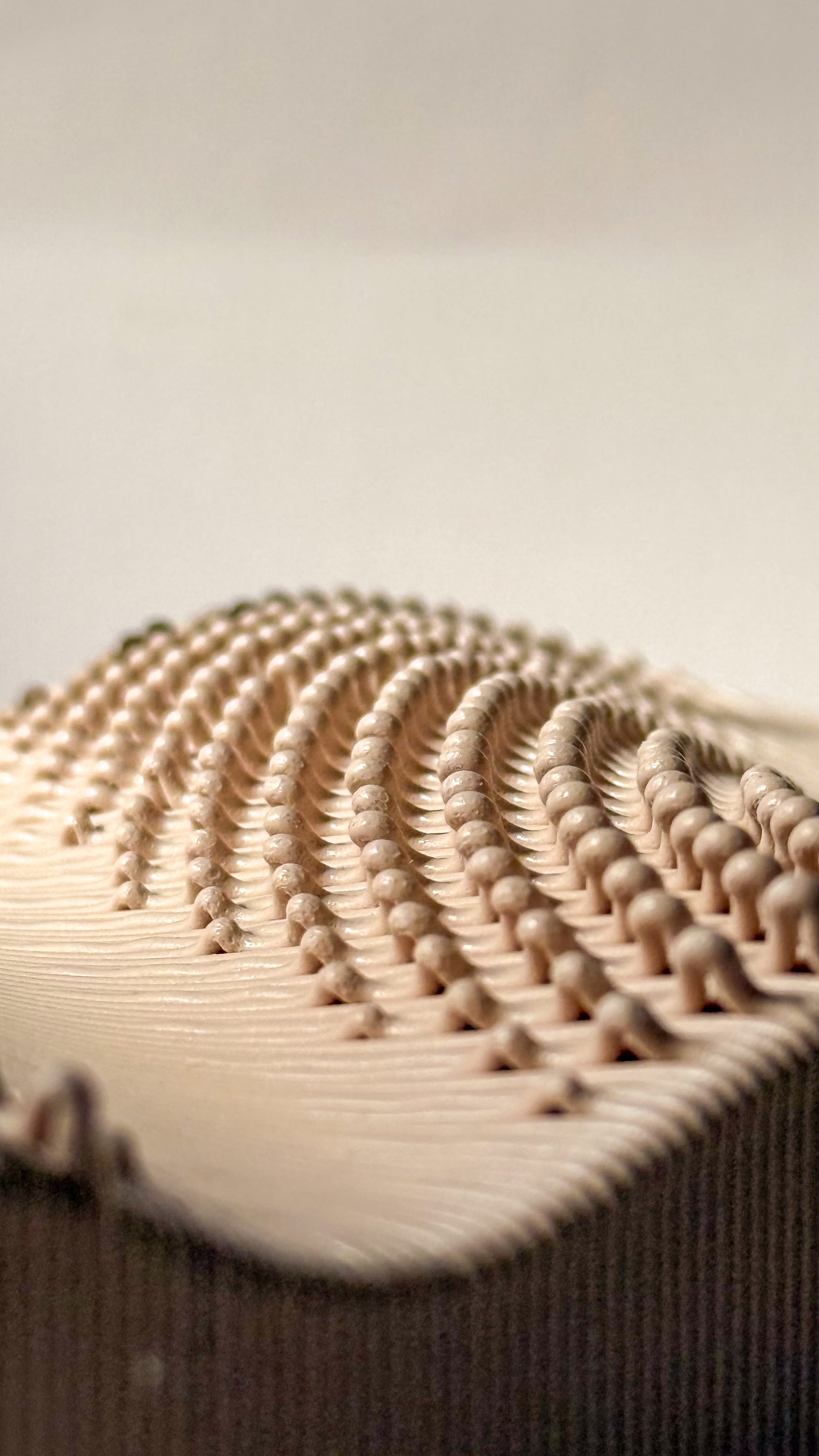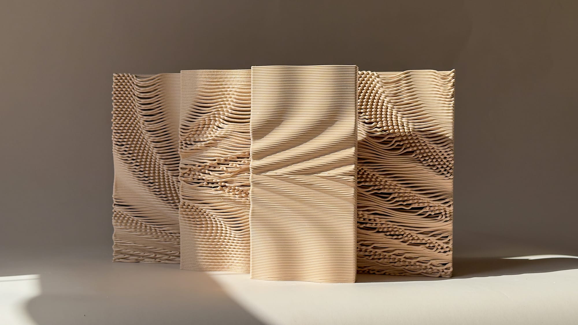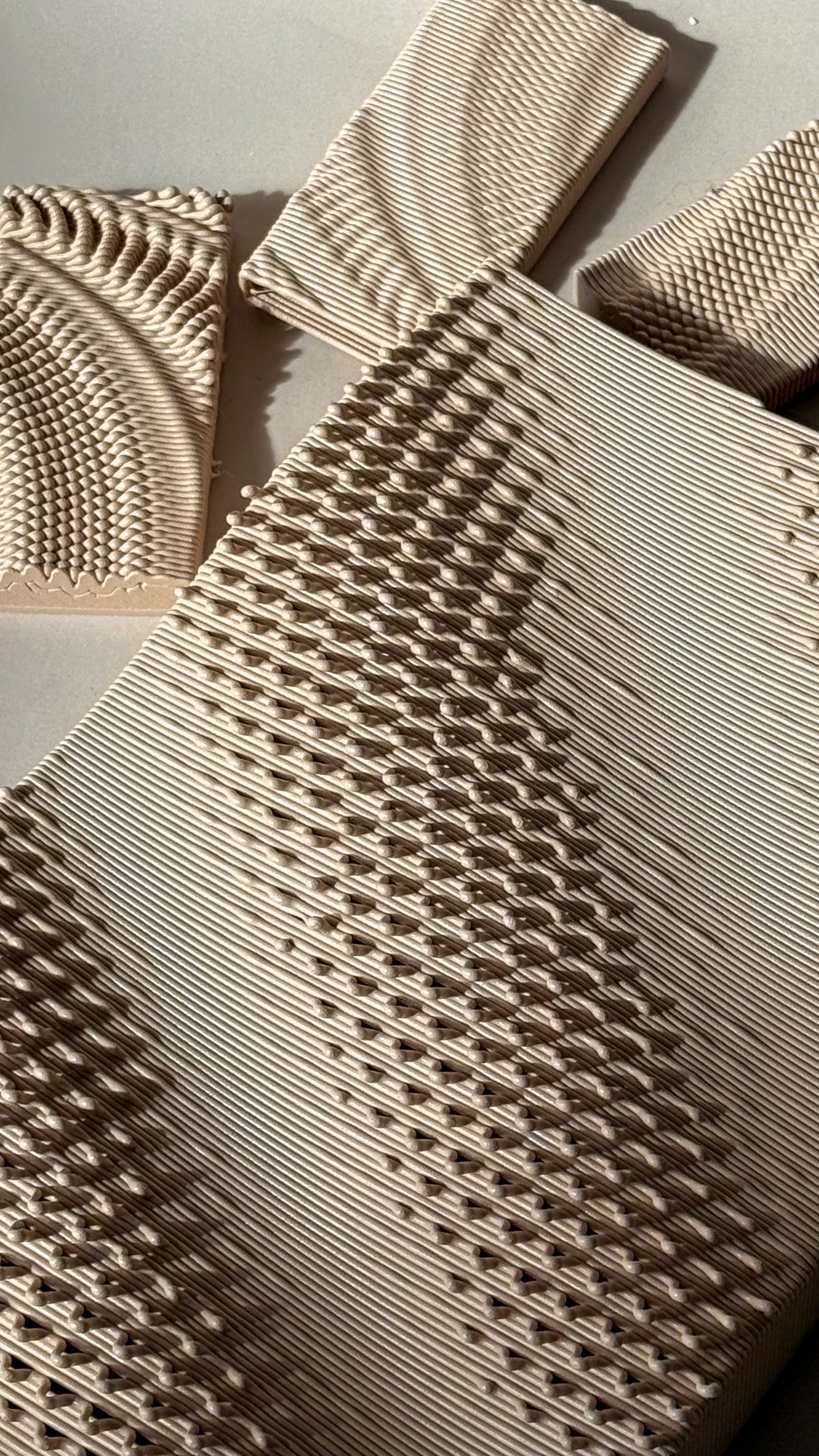 Early issues included inconsistent bed adhesion, often due to insufficient temperature, and minor modelling errors that affected print stability. In one instance, printing PLA at PETG temperatures led to excessive melting, altering the microtexture and causing structural instability. As the G-code workflow became more refined, I began to explore alternative pattern translations. One approach involved encoding the pattern within a single layer, shifting from vertical undulation in Z to planar variation. Despite this geometric shift, the results remained recognisably part of the same system, demonstrating how the pattern could persist across different modes of expression.