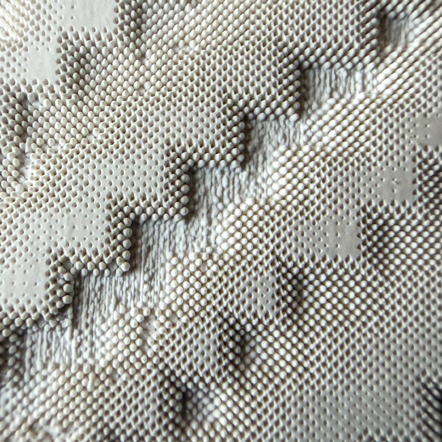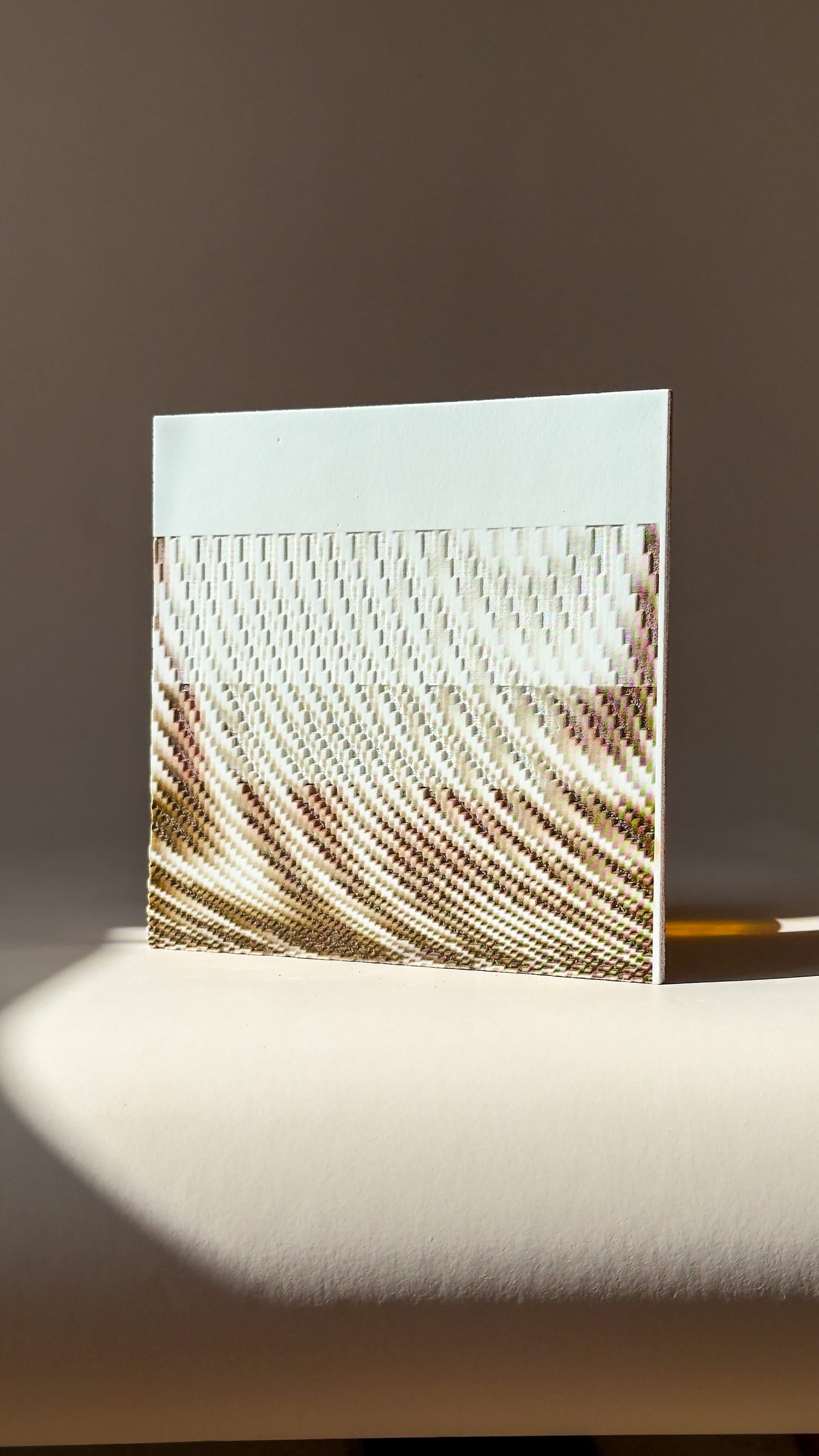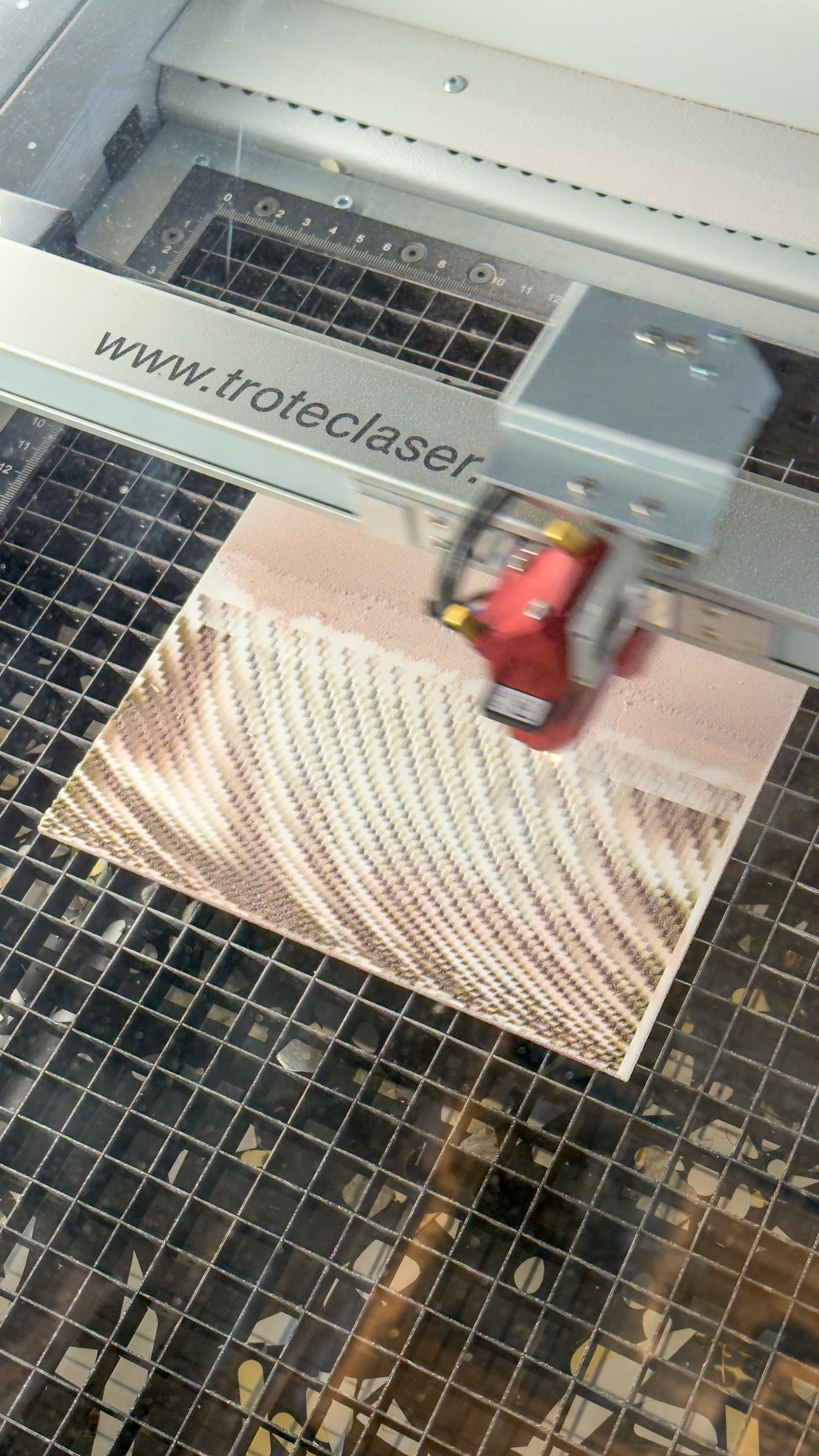 The behaviour of the laser introduced a different type of constraint. Rather than a continuous response, the relationship between greyscale values and etch depth operated in discrete steps, making calibration critical. Fine-tuning these values became essential in predicting outcomes. At a micro scale, the etched surfaces revealed a point-based grid structure inherent to the bitmap interpretation, which became particularly evident under magnification. Power settings were adjusted depending on material and depth requirements, with multiple lighter passes often producing more controlled results than a single high-intensity exposure.