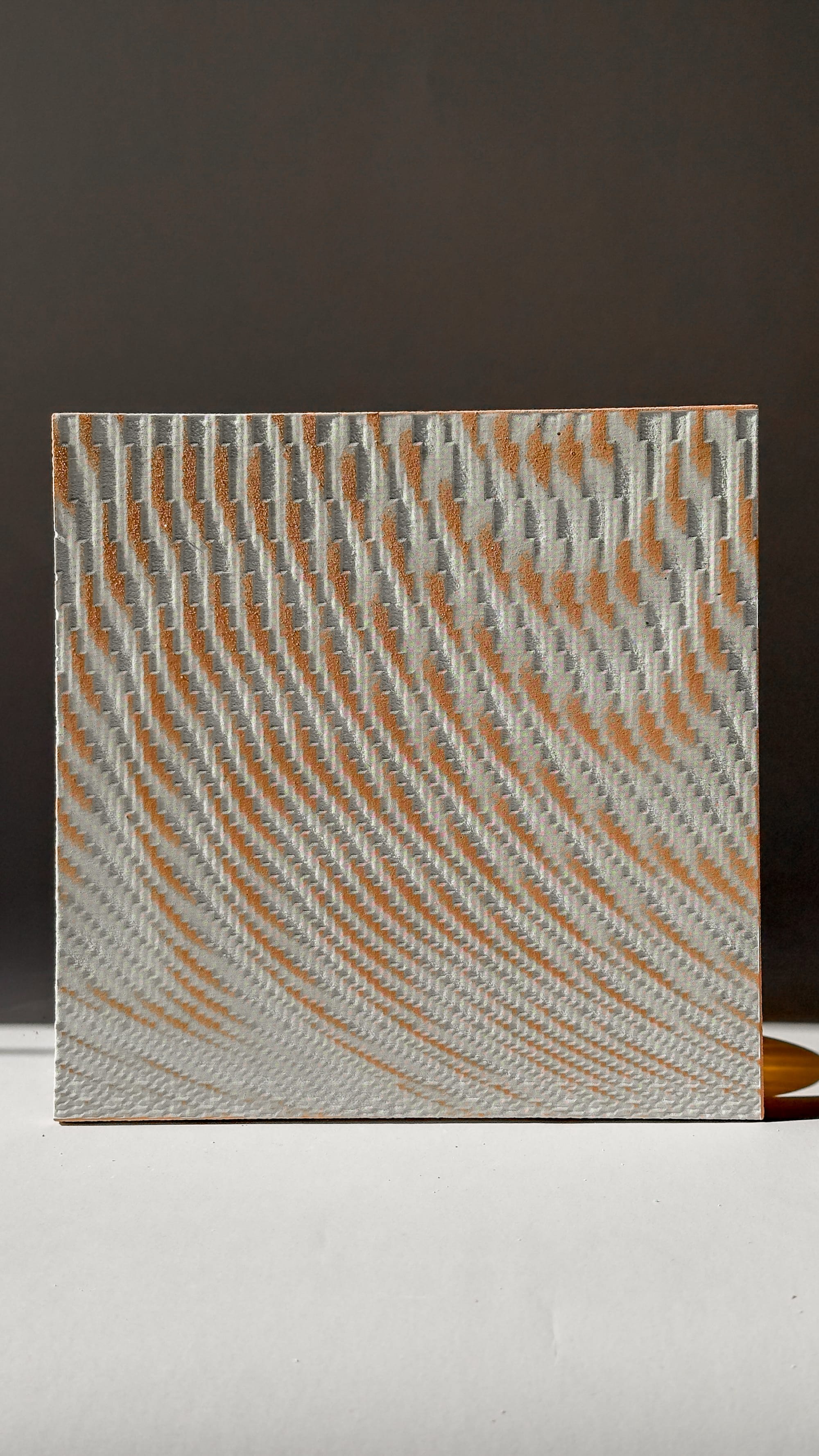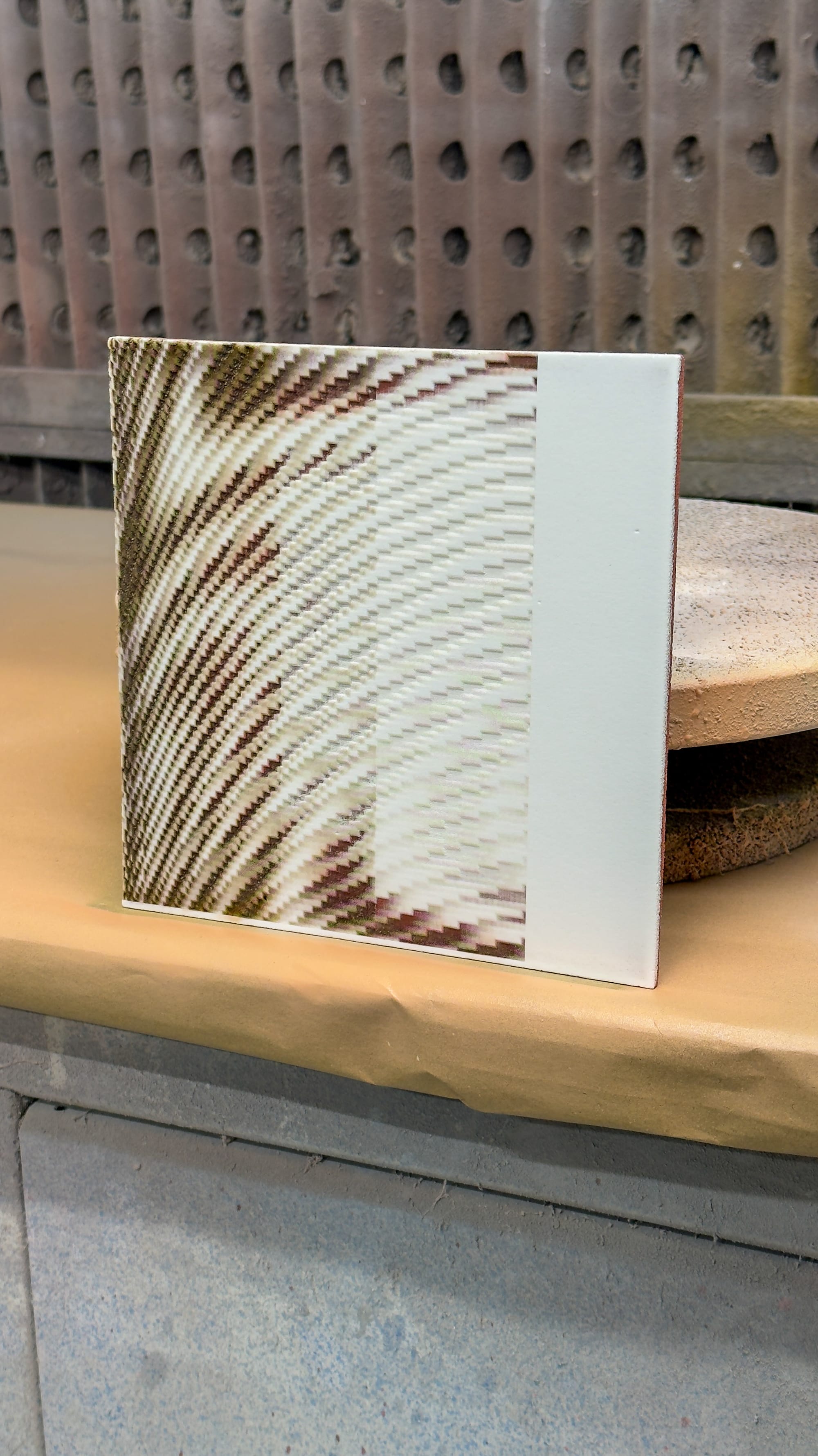 Subsequent tests focused on etching directly into cast tiles with layered pigmentation, where the process revealed underlying colour strata. This required careful calibration, often involving multiple passes to achieve the desired depth. In parallel, I tested etching through spray-painted surfaces, allowing the pattern to emerge through selective removal. The interaction between colour and physical depth produced a range of surface effects.