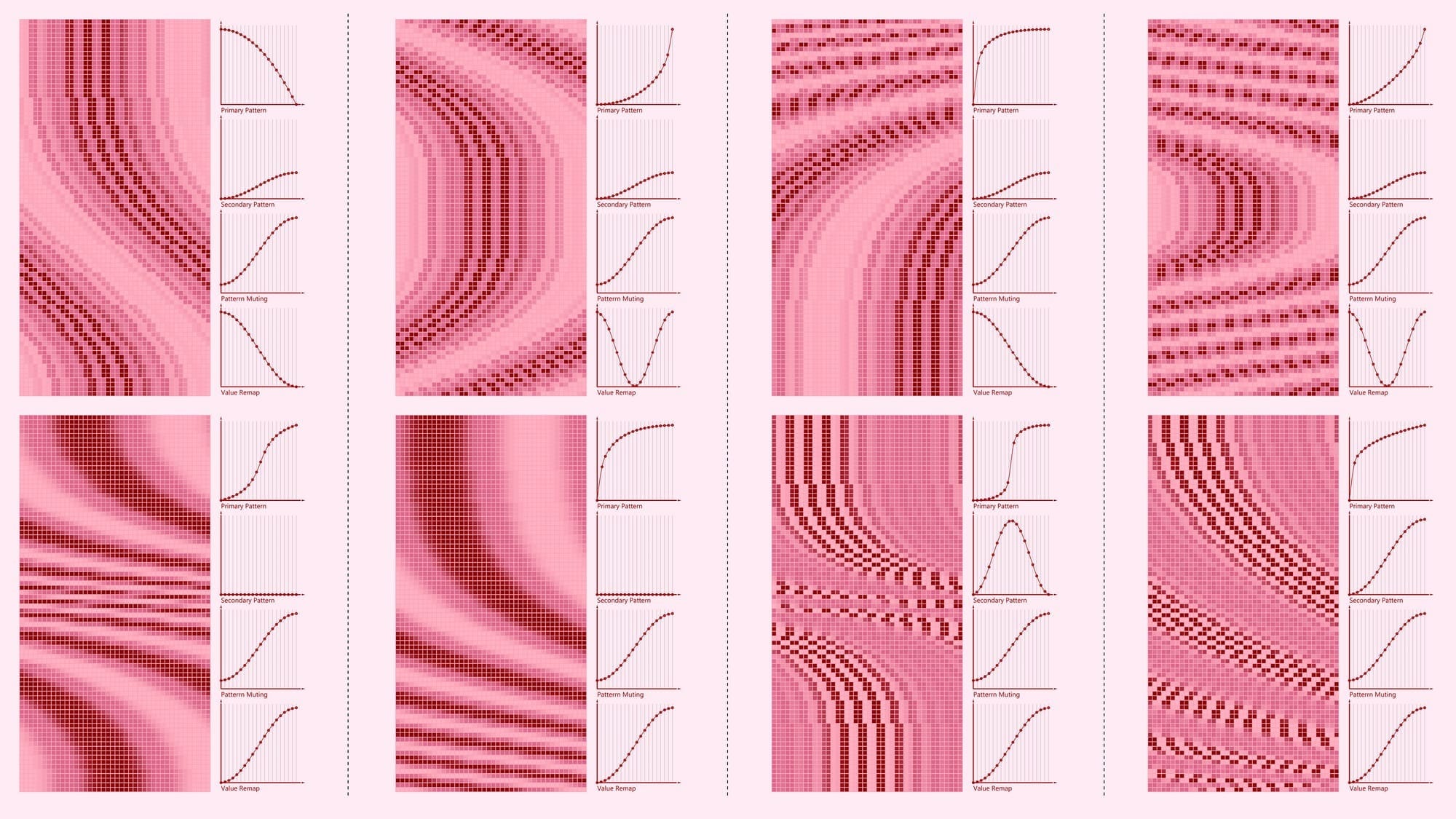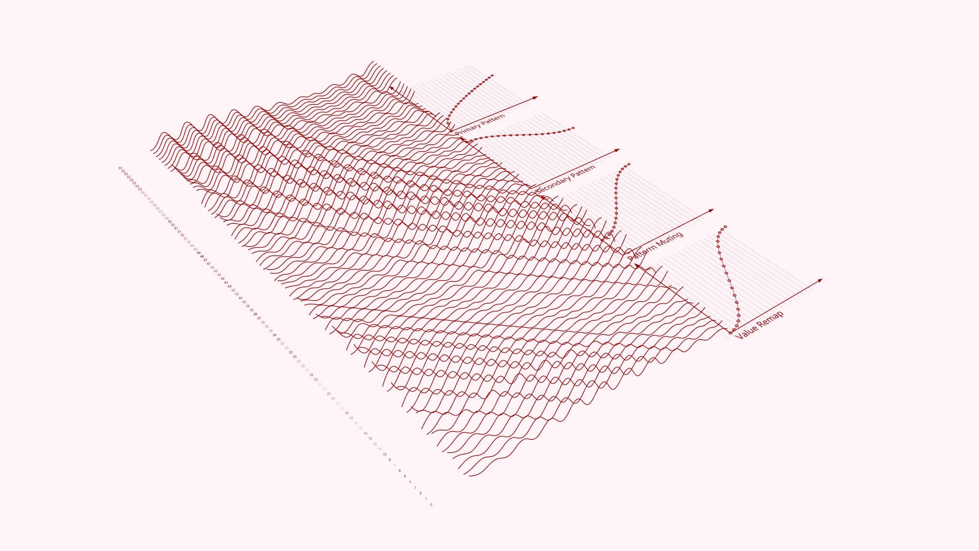 I began treating the pattern less as geometry and more as a data management system. A simple grid, controlled by basic mathematical functions, became enough to produce a flowing, continuous pattern without heavy post-processing. The key operation was the shuffling of data within that grid. Control over this shuffling became the main way of steering the pattern itself.